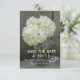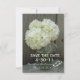 Ett bröllop spara datum med ett foto av ett burk av vita vattendrag över en bakgrund av barnved. Anpassa den vita texten med namn och datum. Leta efter matchande inbjudningar på Jill's Paperie.