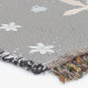 Vitaktig "Hygge"-text i blek blå med mönster av små vita snöflingor, blå och blek rosa blommor på gråttets bakgrund.