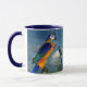 Vibranta, unika och konstnärliga tropiska 3D-makor med färgade fjädrar i blått, grönt, orange, gult färg i vild under blå himmel och vita moln skapat av Bulgan Lumini (c).