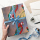 Vibranta, unika och konstnärliga tropiska 3D-makor med färgade fjädrar i rött, blått, grönt, orange, gult, vit färg i vild under rosa sunset himlar, röda kvistar, rosett band och ljusa gem-stenar skapat av Bulgan Lumini c.