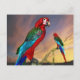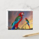 Vibranta, unika och konstnärliga tropiska 3D-makor med färgade fjädrar i rött, blått, grönt, orange, gult, vit färg i vild under den rosa solnedgången himlar, skapat av Bulgan Lumini (c).