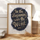 Inspirera tro och eftertanke med denna eleganta konsttryck som presenterar Johannes 1:1:s djupa ord. Den vackra guldbokstaven mot en bakgrund av djupblå och stjärnprydd accent skapar en visuellt slående och andligt upplyftande design. Perfekt för att tillföra en touch av elegans och inspiration till din hemmiljö eller kontorsdekor.