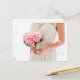 Bröllop-kortet med en bild av en vacker brud i vit klänning med vackra rosa blommor buquet och citat i rosa: " Idag är en bra dag för att påbörja ett underbart liv" Det här är det bästa och nummer 1-designen för din rasdag.