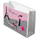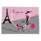 Rosagrått och svart. Eiffel torn i bakgrunden. Fashionably klädd kvinna som går henne hund och bär shopping bag. "Bonjour" och "Oh LaLa" över.