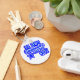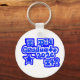 An Aluminum Circle Key Chain, with a Drawing/Design, in navy blue, with a Lighter blue, stripe, going through the letters and numbers and a star, = (Drawing/Design by P.J.M.) on the Front.