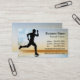 Unikt, modernt affärskort för Professionell Trainer and Fitness Coach som sätter dig före konkurrensen med stil och rent linjer. Att köra mansilhuett över ljusblå och brun bakgrund med hjärtslag. Matchande bakåtdesign för kort. Anpassa fram- och baktext med din information.