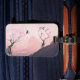 Märkrn för bagagepåsar i "i lugn och ro" har ett vår japanskt bergslandskap stil med rosa soluppgång, ett vackert blommar träd i rosa. Det finns en kran som lyfter från ett redo i träd gren för att flyga över bilden av måne och en hjort som står i förgrunden med antenner som är träd grenar med vår knoppar.