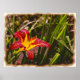 En lätt vintage tittar ett foto av en röd och gult daglig lilja med droppar av vatten på petalerna och löven.