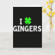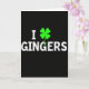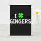 Detta kort har en djup svart bakgrund med ett stort, centrerat meddelande som lyder “I ☘️ GINGERS” med versaler i vita bokstäver. “I” sitter till vänster, den lysande fyrklöverersättningen för ett hjärta i mitten, och “GINGERS” sträcker sig över till höger i samma kraftiga stil. De vita bokstäverna har en lätt fläckig, sliten textur som får dem att se mjukt väderbitna ut snarare än snygga. Klövern är en ljus elektrisk grön färg 💚 med släta rundade blad, som sticker ut som den enda färgen mot det svarta. Med klövern som fungerar som en ersättning för tillgivenhet, känns layouten som ett fräckt litet kärleksbrev eller en vänlig hälsning. Allt hålls enkelt och centrerat, vilket lämnar gott om öppen sv