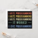 Roligtens utformning, perfekt för alla som är programmerare, teknikspecialist, kodare, ingenjör, IT student eller någon som kan koda kärlek! Jag hatar programmering. Det fungerar! Jag citerar programmeringsprogrammerare, teknikentusiaster, kodrar och utvecklare i Kärlek. Ska du jobba med teknik och vara en del av den tekniska personalen, kärlek? Förstärka stil med den här coolan! Underbar gåva till IT-högskolan student, teknikspecialistanställd, teknisk medarbetare eller datatekniklärare.