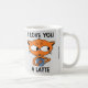 Det här humoristiska kaffet mugg har en söt tecknad katt som håller en mugg kaffe! Mugg läser att jag KÄRLEKAR DIG EN LATTE.