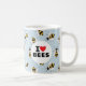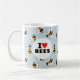 För den budbärande apiarist, levande trädgårdsmästare eller vänskapligt sinomolog visar mugg en passion för pollinerare med den klassiska texten "I Heart Bees" på en vit cirkel över ett mönster av illustrerade och vänligt tittar bin på en mjuk himmel blå bakgrund.