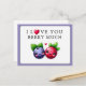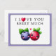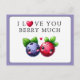 Ett charmerande vykort med ett sött blåbär och jordgubbsbär med det söta budskapet "I Kärlek You Berry Mycket." Perfekt för att skicka ett lekfullt och hjärtligt meddelande till någon speciell. Detta lovvärda vykort är ett roligt sätt att uttrycka kärlek och belysa någons dag.