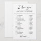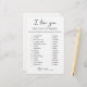 Köp St. Valentines day-spel och njut av högkvalitativ I kärlek du värld runt-kort till party! Matcha varje språk med rätt översättning av "I kärlek you"-svar: 1-J, 2-L, 3-I, 4-M, 5-O, 6-N, 7-K, 8-G, 9-C, 10-A, 11-H, 12-B, 13-D, 14-F, 15-E Black and White-design.