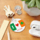 Den irländska tricolor-flagga med rött hjärta i flagga mittvita panel, en grönt schysrock på flagga orange på högerna och brev I i vitt mot bakgrund av flagga grönt till lämnat. Att läsa från lämnat till höger av symbolerna uttrycker " I kärlek / Hjärtkryp " Texten i grund är anpassade och kan vara personlig och flyttat var som helst på nyckelringen Enkel att anpassa och anpassa. I Kärlek (Heart) Shamrock Ireland Collection