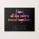 Det här heltäckande svarta pusslet har en vattenfärgsregnbågsbildtext som lyder: "I kärlek hela färg blandade ihop" och ord "BLACK" med versaler svart teckensnitt med vit kontur. Det gör perfektens roligt till varje Black Älskare.
