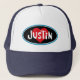 Monogram basebollsockel med stiliserad "Justin" i namn