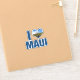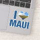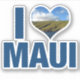 Jag kärlek Maui Hawaii-klistermärke med ett sött hjärtformade foto av de blå hawaiiska havs- och grönt bergen. Vackra kustnära vatten gör mig lycklig på sommarsemester. Teksaksfotografi med väderkvarnar på backe.