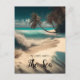 Turquise vatten och handflatan träd på ett vitt vykort för sandstranden citat: "I kärlek med havet."