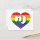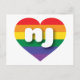 Det här vykortet har ett hjärta med regnbågsdesign och det feta, vita, nedre fodral brev nj, en lekfull förkortning för New jersey, trädgårdsstaten. Baksidan av vykortet är tom och väntar på personligens text eller handskrivna känslor. Visa ditt sanna färg, stödja giftermål jämlikhet och fira gay pride.