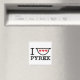 Älskare av vintage Pyrex köksprogram kommer att spela kärlek den här roligten på en ikondesign... I KÄRLEK PYREX med en blandande skål med tre röda hjärtan. Finns även i vitt (för mörkens bakgrunder).