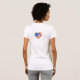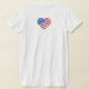 En amerikansk flagga och hjärtan förenar sig för att göra denna söta patriotiska grafik som säger "I Kärlek USA". Det finns en komplementtryckt text på baksidan av t-shirt.
