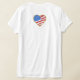 En amerikansk flagga och hjärtan förenar sig för att göra denna söta patriotiska grafik som säger "I Kärlek USA". Det finns en komplementtryckt text på baksidan av t-shirt.