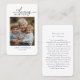 Med det här vackert designade bönekortet för begravning kan du skapa en hjärtlig hyllning till din kära. Lägg bara till favoritfotot och anpassa texten med ett meningsfullt meddelande eller en meningsfull skript. Kortets framsida har klassisk, tidlös typografi för att hedra minnet, medan baksidan innehåller en bön för anpassadet eller dikt som ställs in mot en slimmad svart bakgrund. Det här kortet, som är väl utformat, fungerar som en omhuldad keepy som ger komfort och hågkomst för familj och vänner.