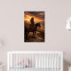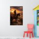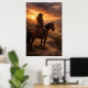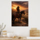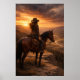En ensam ryttare stannar upp till häst på en höjd med utsikt över en vidsträckt dal medan det gyllene ljuset bryter igenom dramatiska kvällsmoln. Denna fridfulla västerlandskap fångar en tyst moment av eftertanke och frihet på det öppna området.