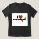 Cut I Love Basketball tshirt has. a bold text on white background with heart shaped basketballs. Art copyright Ann Powell all rights reserved.