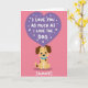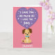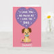 This greeting card features a cute cartoon dog sitting near the lower middle, looking up with big black eyes and a small blush on its cheeks. The dog has light tan fur with brown spots, floppy ears, and a bright blue collar around its neck. Above the dog, a large purple heart-shaped speech bubble fills the top half of the card like it’s speaking. Inside the heart, the message “I LOVE YOU AS MUCH AS I LOVE THE DOG” is written in bold, white block letters, with small white hearts sprinkled around it. Near the bottom, right under the dog’s paws, the extra line “(ALMOST!)” appears in white script to add a funny, sweet twist. The background is solid bubblegum pink, keeping the focus on the dog and the love note ❤️💌. It feels like a light, caring way to say “you matter a lot” with a little pet-owner honesty 🍫.