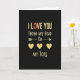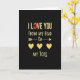 This greeting card features the message “I LOVE YOU FROM MY HEAD TO MY TOES” on a deep black background. The words are in worn-looking gold letters, centered and easy to read. “I LOVE YOU” sits at the top, and the “O” in “LOVE” is a bright red circle that stands out ❤️. Below that, “FROM MY HEAD” appears in the same gold lettering, followed by a simple gold arrow that points downward. Near the arrow is the small word “to” in a flowing cursive style, leading your eye to three gold hearts. At the bottom, “MY TOES” finishes the line in gold, tying the whole message together. It feels meaningful because it says you care about someone completely, from start to finish, in a sweet and direct way 🥰. Hope it helps you share Valentine’s Day sentiments with someone you care about.