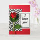 This card shows a single deep red rose with soft, velvety petals opened wide, set against a strong red background ❤️. The green stem and leaves sit on top of a piece of paper covered in a black-and-white maze-like pattern. Next to the rose, a bright white card overlaps the patterned paper, making the message stand out. A dotted black border frames the white card like a simple picture frame. The words “I love you” appear in smooth, flowing black lettering near the center of the white card. The mix of red, green, and black-and-white feels romantic and direct, like saying what you mean without overthinking it 🥰. It’s the kind of card that fits a partner or a close friend when you want them to feel seen and cared for.