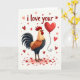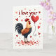 This charming Valentine’s Day card features a cheerful rooster front and center, full of personality and warmth. The rooster is illustrated with soft beige, rust, and charcoal feathers, accented by a bright red comb and wattles that instantly draw the eye. Floating nearby is a large red heart balloon tied with a curly black string, adding a sweet romantic touch. Pink and red hearts surround the scene, while heart-shaped petals scatter across the ground below. Above the rooster, the words “i love your” appear in a bold handwritten style, playfully leading into a heartfelt message. This card blends humor, affection, and charm, making it a delightful way to share love and smiles on Valentine’s Day.