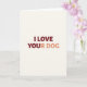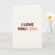 This greeting card keeps things simple and sweet, with the message “I LOVE YOUR DOG” as the main focus. The text sits centered on an off-white background with lots of open space around it. The letters are thick, rounded, and in a clear sans-serif style that’s easy to read. Most of the words are in deep maroon, but in the word “YOUR,” the “YO” is maroon while the “UR” switches to a soft peach-coral color.