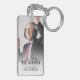 Personligens nyckelkedja för begravning av minnesmärken med ett foto på dubblan av den som har gått bort, ett vitt överlägg, talesättet "i kärleksminne" och namn.