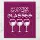 Funny wine pun: “My doctor says I need glasses.” Three wine glasses deliver clever wine humor. Perfect for wine lovers and party nights. Celebrate with witty, adult humor.