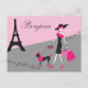 Rosa grått och svart. Eiffel Torn i bakgrunden. Fashiontert klädd kvinna som går på hennes hund och bär på shopping bag. "Bonjour" och "Oh La" ovan.