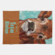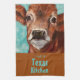 Den här lilla kalven påstår att hon springa "A Texas Kitchen", som är en garanti för bra Texan måltider! Kon är en rostig brun och bakgrunden är akvarier. Du får inget nötkött med den här handduken.