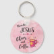 Det här är en kristen nyckelkedja av typen "Ett av ett slag"! Den har den komikliga kristna citatet "I Springa on Jesus, Chaos och kaffe" och en Rosa som styr Mugg av Hett kaffe... Omgiven av Flowers och Hearts på en Rosa Watercolor Background! Original Graphic Art Design by Artist Kerry Miller.