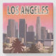 Den färgrika vektorillustrationen som presenterar en ursnygg horisont, dominerade vid skyscraper och palmträd från i stadens centrum Los Angeles med en härlig kalifornisk solnedgång i bakgrunden.