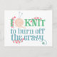 Ett typografiskt vykort i stil för stickare som vet hur avslappnande deras farkoster kan vara. Det stickande talesättet lyder: "I sticka för att bränna av det galna" och är skrivet med stiliserad typografi i mjuka blå och grönt. Ordalydelsen är dekorerad med rosa hjärtformade vinstockar, stickgarn och nål. Bläddra i vår butik för att hitta matchande och koordinerande element.