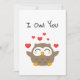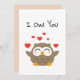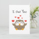 Lilla söt illustration och lycklig uggla med varma röda hjärtan som flyger runt. En rolig fågel i ljusbrunt färg och med gult tassar. Uggla ger lycka och kärlek, och gillar att muntra upp dig eller skicka bästa önskemål till någon du gillar. Du kan också anpassa bakgrunden efter dina behov.