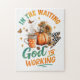 Fredlig, färglös design med en fall-/höstscen med en pumpa, kopp av kaffe, fjärilar och blommor. Den färgstarka inspirationstexten lyder: "I väntetiden fungerar Gud". Den här utformningen är tillgänglig för en mängd olika produkter.