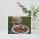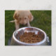 En labradodle-valp med en stor skål mat framför sig.
