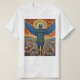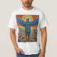 A.I.Assisterad utskrift av ett vingat figur, ett exempel på det mytiska antika grekiska Icarus, med blommande blå fjädrar ovanför ett färglöst citysskum, omgivet av ett strålande sol och snurrande himmel.