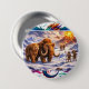 Round badge framing a woolly mammoth and bear watchers as torch-lit travelers cross snow under an erupting volcano — bold colors, field-sketch vibe, made for jackets and bags.