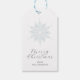 Isblåsnowflake "God jul" personlig namn julklapp märkre med elegantens kalligrafi. Detaljerad isig blå snöflingdesign. Anpassa med din familj namn i mörkens kalligrafi och serif-skrift. Designad för att matcha vår isblå snöflammande julsamling.