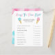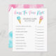 Genderna för det vita glasstemat visar party-spelkortet med vattenfärgstryck som illustrerar rosa och blå glass på en våffelkon. Texterna kan redigeras. Perfekt att spela under duschen. Den räknar upp det viktigaste baby och ber gästerna att gissa det prisa. Den som gissar prisa vinner närmast!