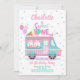 Cute-födelsedagsinbjudan i stil. Tema: Ice Cream - Här är skotten. Tillfälle: Kid Girl 1st Birthday Party. Stil: Cute, Cheerful, Roligt, Elegant. Färg: Rosa, Lila, turkos, vitt. Grafik: Ice Cream, Ice Cream Lastbil, Pastel Balloons, Polka dots.